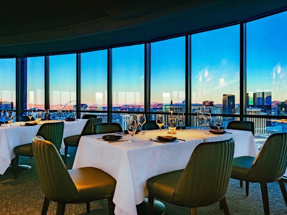 Perched on the 50th floor of the Masquerade Tower, the restaurant delivers one of the most dramatic vantage points in the city: wide-ranging views of the Strip and valley that stretch out like a glittering ribbon below you.