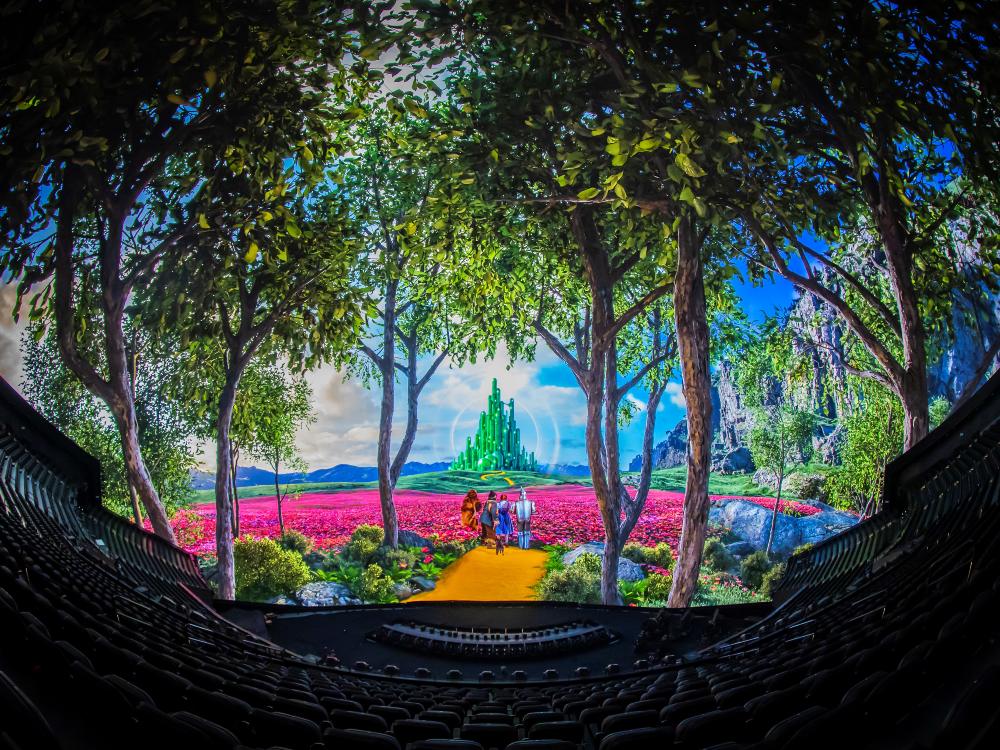 We experience The Wizard of Oz, with the 1939 classic movie remastered for the 160,000-square-foot, 16K resolution LED screen. The Sphere is a reminder of how breath-taking new technology can be, as industrial fans send leaves, scents and sprays spinning around, turning Dorothy’s tornado into a multi-sensory experience that makes you feel like your glasses are about to fly off. The scale is immense.
